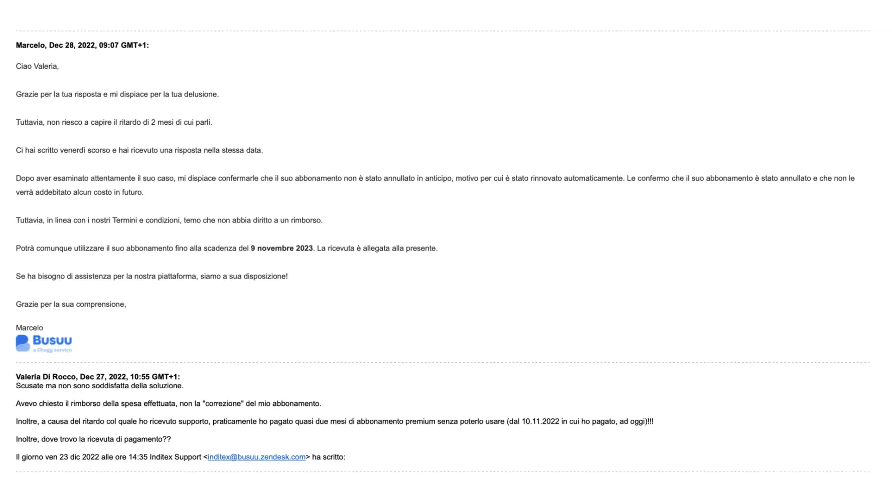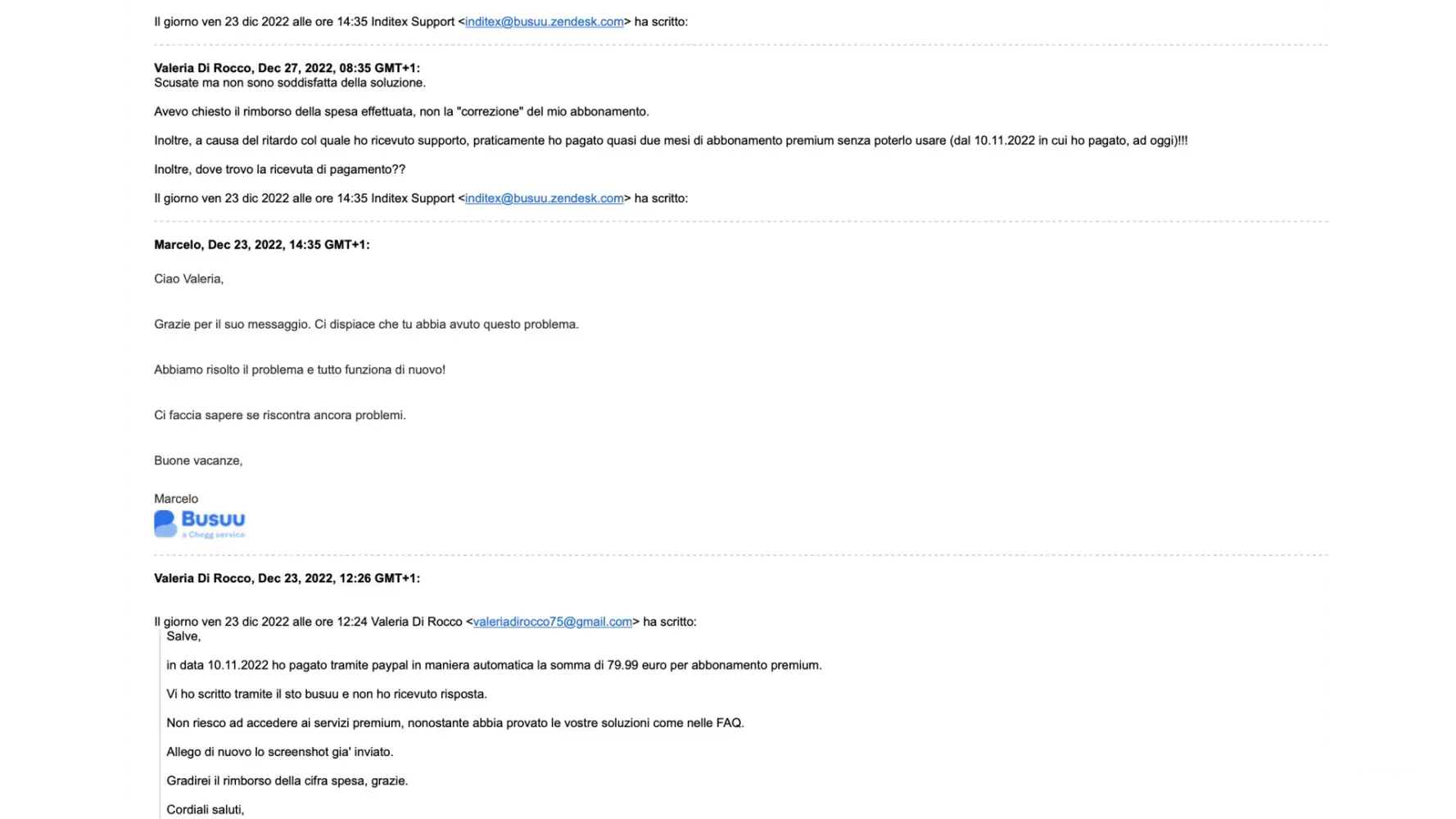 Mi e' stato risposto che avevano risolto il problema. Come? Abilitando l'abbonamento Premium. E che il rimborso della spesa non era possibile (usando tra l'altro frasi preconfezionate, copiate e incollate, passando da "tu" al "lei" senza rileggere)