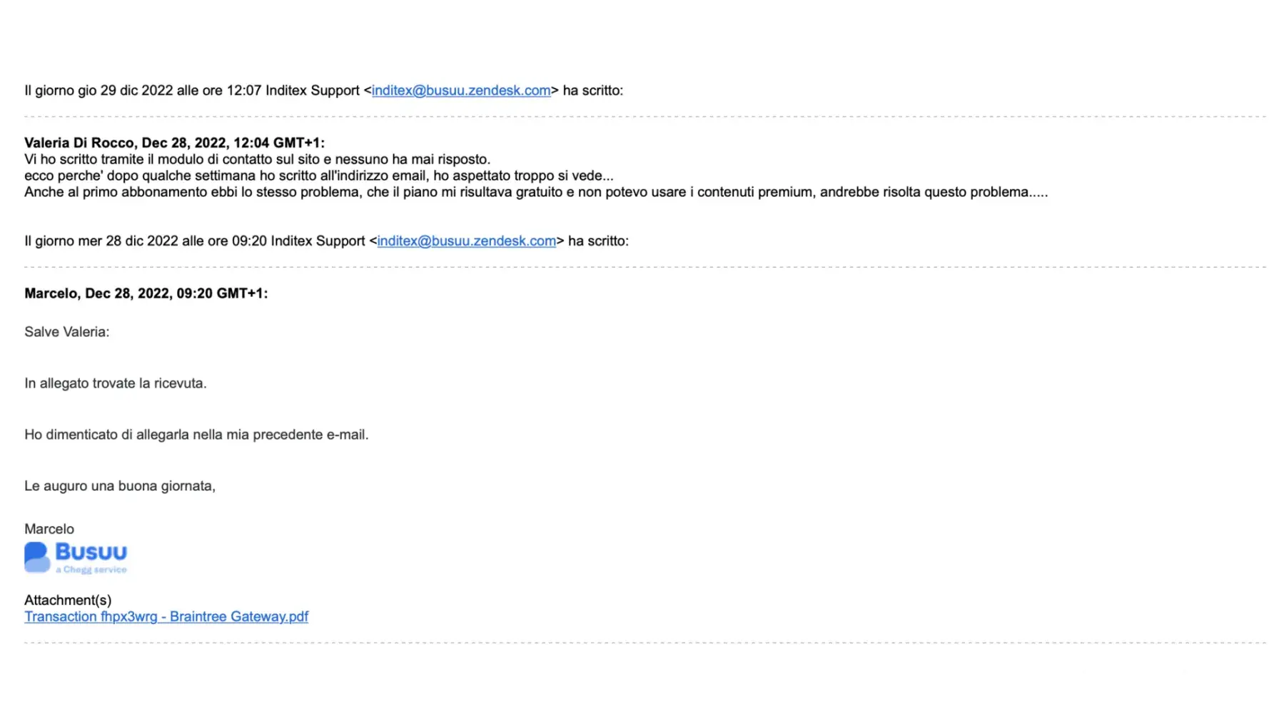 Contattato supporto tramite email, chiedendo il rimborso della cifra prelevata, considerando anche il fatto che, nonostante il pagamento, il mio abbonamento premium era inaccessibile (risultava infatti un piano gratuito effettuando il login).