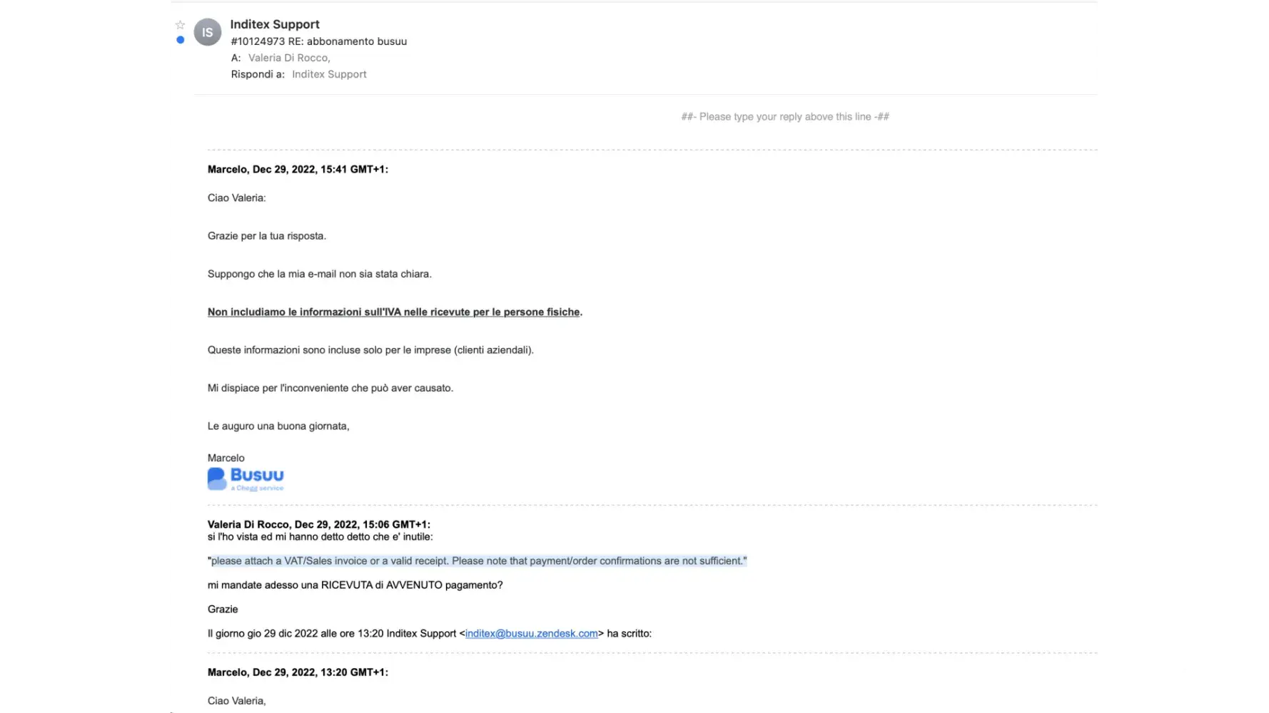 Successive richieste di ricevere normalissime ricevute vengono rimbalzate, anche scortesemente, sempre con la frase "Non includiamo le informazioni sull'IVA nelle ricevute per le persone fisiche."