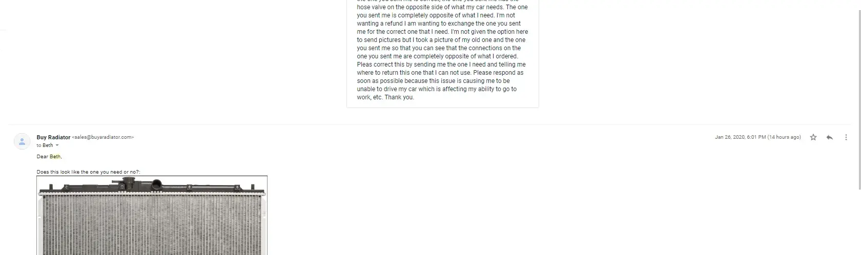 My wife, Beth Strickland ordered a radiator for a 2000 honda accord and specified that she needed a radiator with the hose hookup valve on the left side. Buyaradiator.com sent a radiator completely opposite of what we wanted. We called and no answer. We texted the customer service number, no response. We emailed them, no response. We are not wanting a refund, we are simply wanting to exchange the radiator they sent us for the correct one that we need.