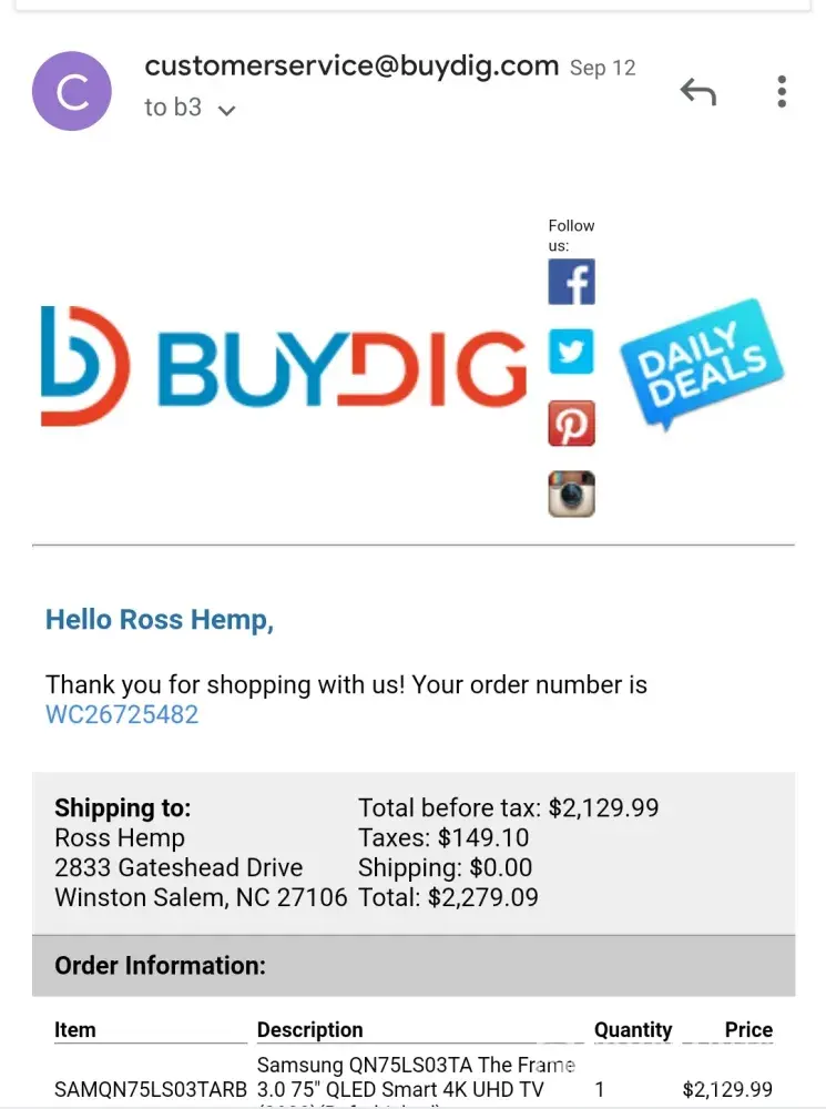I purchased a 75" Neo QLED 4K TV in July 2022. The customer service was excellent, and the communication was clear and efficient. The delivery was prompt and well-handled. Buydig provided me with the best price, including a free wall mount and warranty. I would give them a 5-star rating unless something changes in the future.