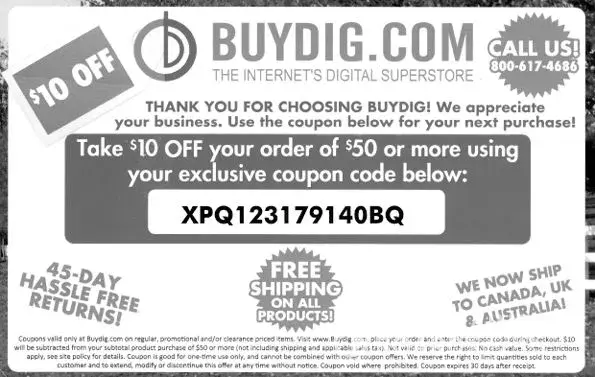 BuyDig.com sent me a coupon for "$10 off your order of $50 or more". I put a Canon camera into the on-line cart and proceeded to check out. The coupon code had expired. I called customer service. Customer service handed me off to Sales. The guy at Sales told me that I couldn't use the coupon on Canon cameras. He told me to read the fine print. "COUPONS VALID ONLY AT BUYDIG.COM ON REGULAR, PROMOTIONAL AND/OR CLEARANCE PRICED ITEMS". I asked the salesman what that had to do with Canon cameras? He told me that he didn't make the rules and that I should buy a Nikon camera. Surely BuyDig.com (d.b.a. Beech Camera) must realize that there's a thing called "the Internet" and that word will get around! I'm sorry that I've ordered products from these people before.
