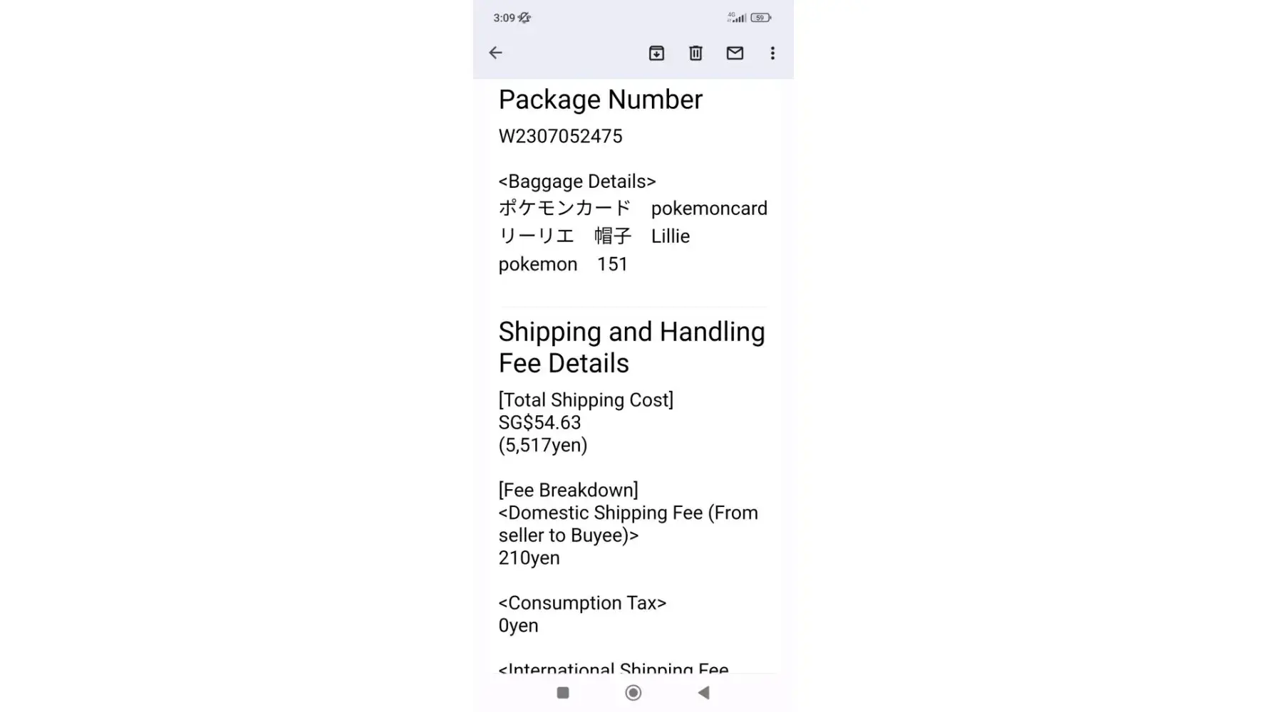 The customer ordered six Digimon dim cards from the same seller, at the same time, but was informed by Buyee that each of the dim cards comes with separate packaging. This resulted in Buyee charging the customer 250yen for each unit's consolidation fees, which totaled 1500yen on top of the shipping fees plus the flat fee per order and the expensive insurance fees of 500yen.