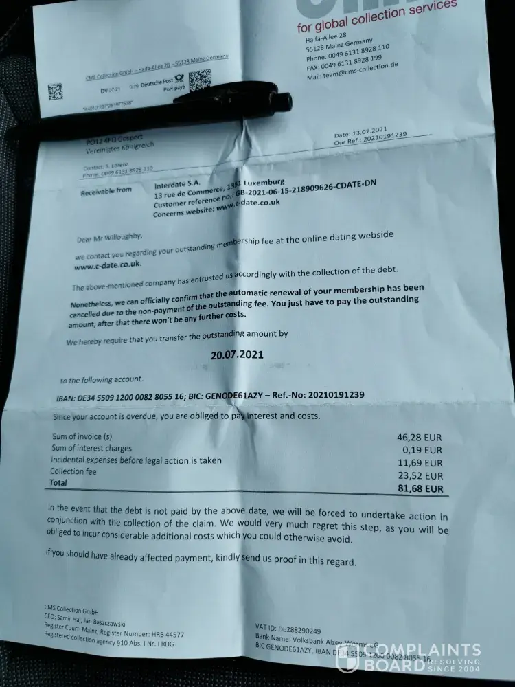 I have now had a letter from CMS Global collection services saying I owe 81.68eur! The whole outfit is a scam! Profiles are not real, cancellation buried and made difficult the claims made about outstanding membership fees!