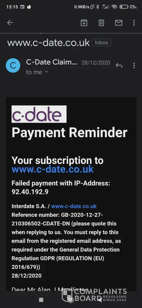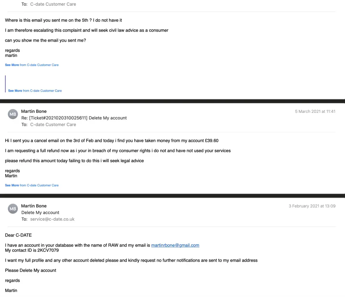 Hi! I am having the same problem! i paid for a month and wasn't aware that it would be a on going monthly thing! I have had all the exact emails you have! I spent a good amount of time requesting refunds and confirming my cancellation but they just ignored it! I heard from them almost 2 months later and that was not in respond to any of my emails that was ignored! It was a final reminder or they will pass me on to there debt collection company. It was only a month later when i found online a cancellation form which i filled out and sent to them that they started to respond to me! Saying they had already responded to my emails confirming my cancellation ( which they didn't ) and that i owe them money because i didn't cancel with in 7 days before the renewal, even though in there terms and condition it says 14 days . They also sent me a letter from CMS Global debt collection which you can tell is fake anyway, I am pretty sure that C - dating and CMS Global are they same people lol. Think about it why would they get a debt collection service on to me that are in the same country ? I am 99% sure they cant do anything to you so you will be fine! All these reviews have the same about getting letters from CMS debt collection but none of them are about any action that they have taken ? Why do you think that is ? quite simply because they do not exists. I recommend changing all your details so they cant keep annoying you! I have changed my bank details and am going to also change my emails address and phone. But do not stress to much dude, these people are crooks and nothing more and they cant do anything.