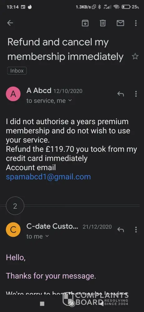 I strongly believe that this is totally unfair, I signed up in good faith at a reduced monthly payment for the first month, I did not authorise or request to extend my subscription beyond this first month, I was charged for a second month which I felt was unfair but ok it is what it is, so I informed C date that I would be cancelling the subscription and any future payments of which they didn't even reply to as there site didn't appear to have the option of cancelling.