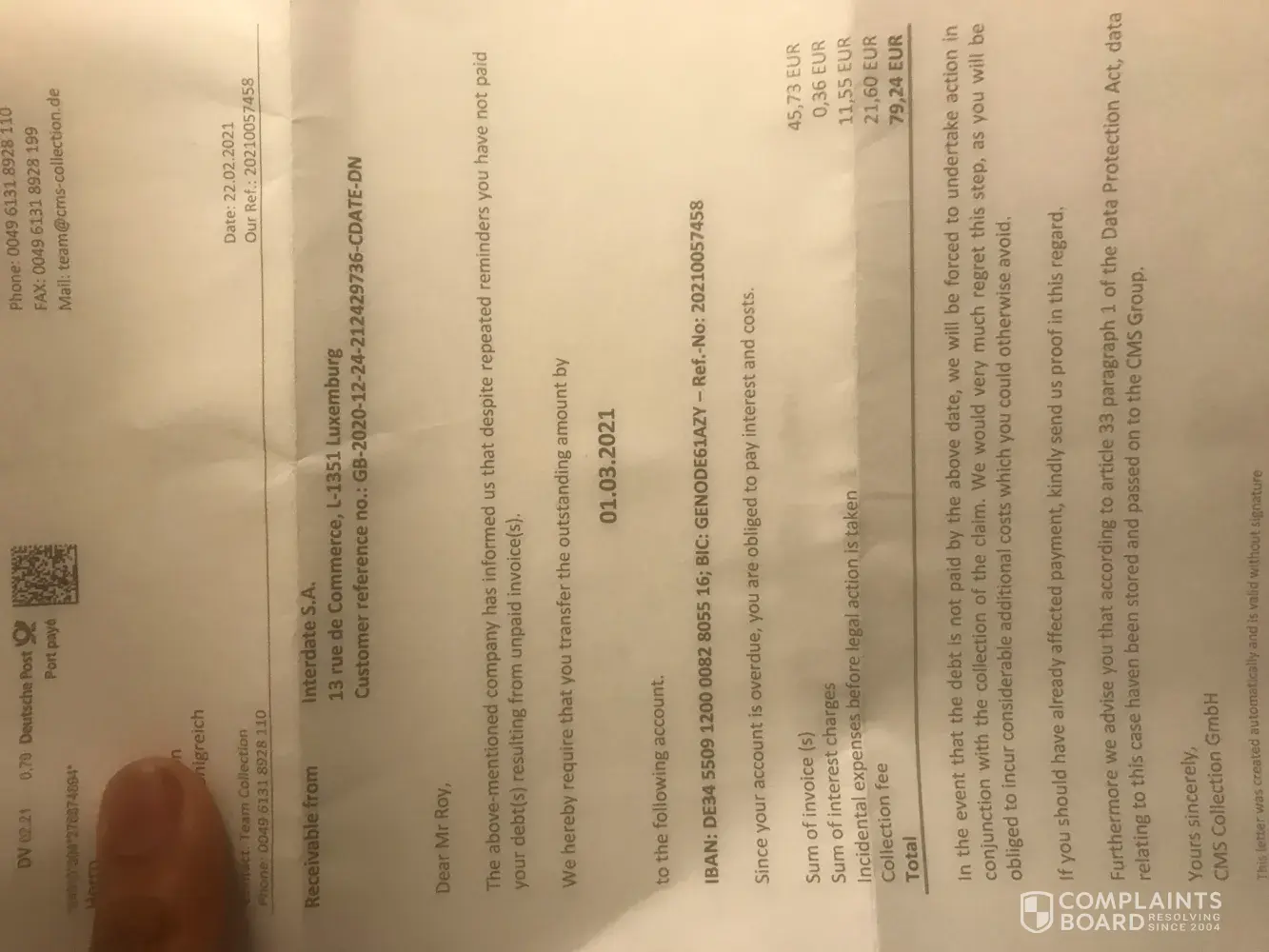 Thinking this was all now sorted I get a letter from CMS global collection services requesting a payment including charges 77.65 euro.