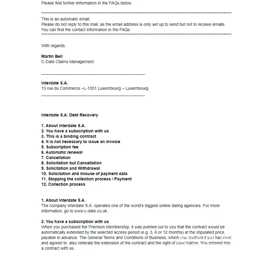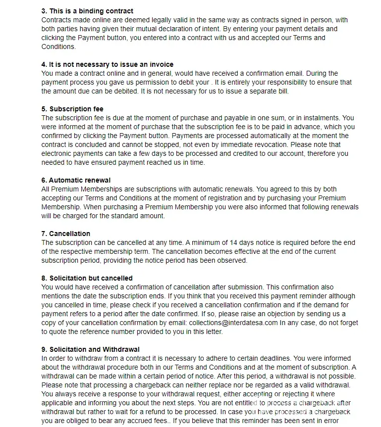 Got the same letter never had a date site were you cannot end your contract or you never knew about the contract till after the free cancellation of 14 days funny that ehh its a way of them making money out of people for there own personal gain and carelessness for others other than themselves not fair really but there saying its legit ye for there back pocket and no one else bet they would leave people to die for money knowing them or uncheerfully give gifts