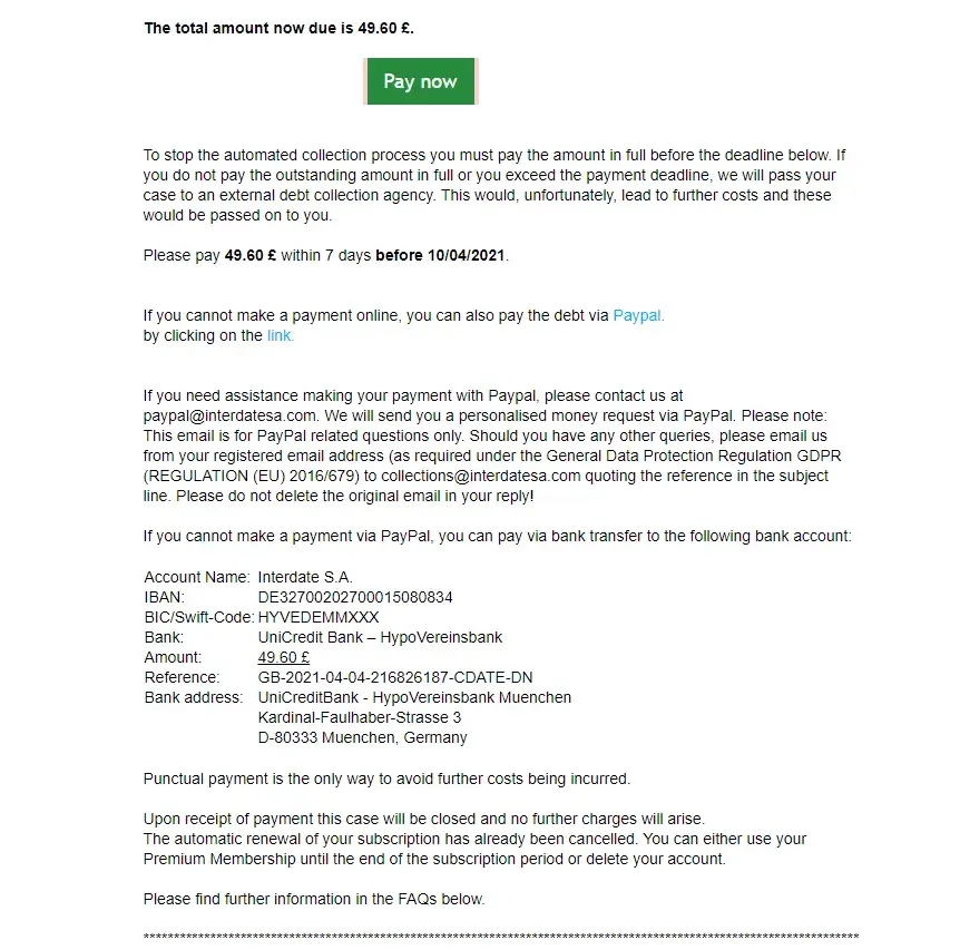 I have contacted Interdate with the details of the email sent and a screen shot of said email and there reply is this attached. Basically due to there incompetence they have put it in the hands of a debt collection agency. Would someone please tell me how to resolve this at your earliest opportunity.