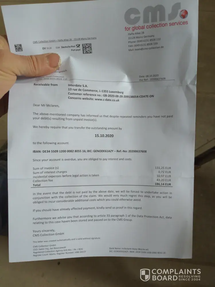 I never subscribed to C-date and know incurred debts. Received a letter today stating pay by 17/09/20 or incur more costs! There is not an English speaking person to talk too and only a fax number. How can you sort this out and I'm certainly not paying therefore you can contact CMS global management services and inform them there is NO debt to be collected. You can also delete me from your list!