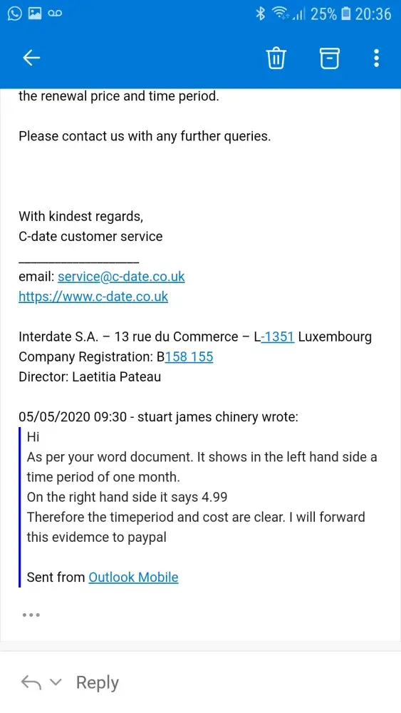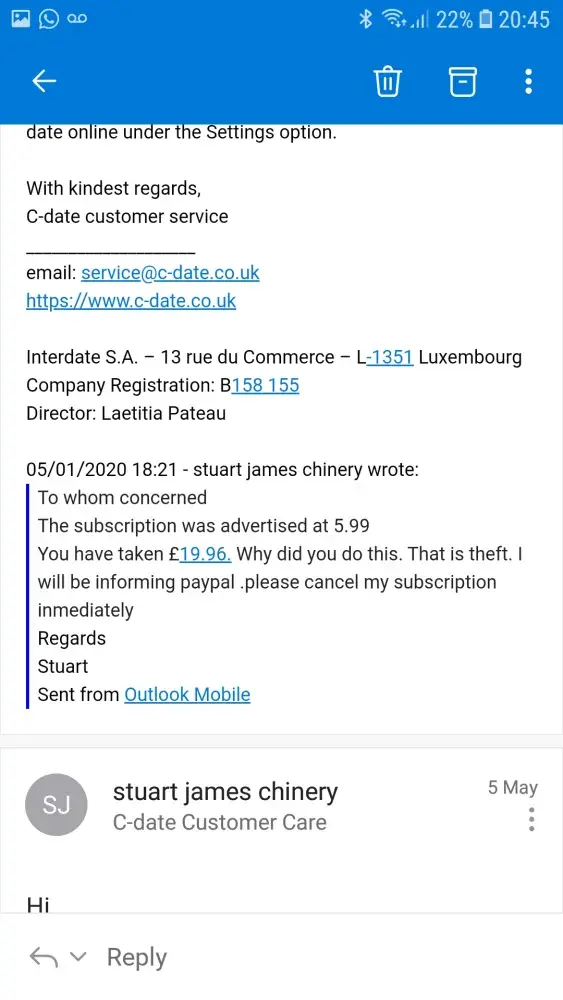 I have emailed both [protected]@c-date.co.uk and [protected]@c-date.com with 'Complaintsboard.com'