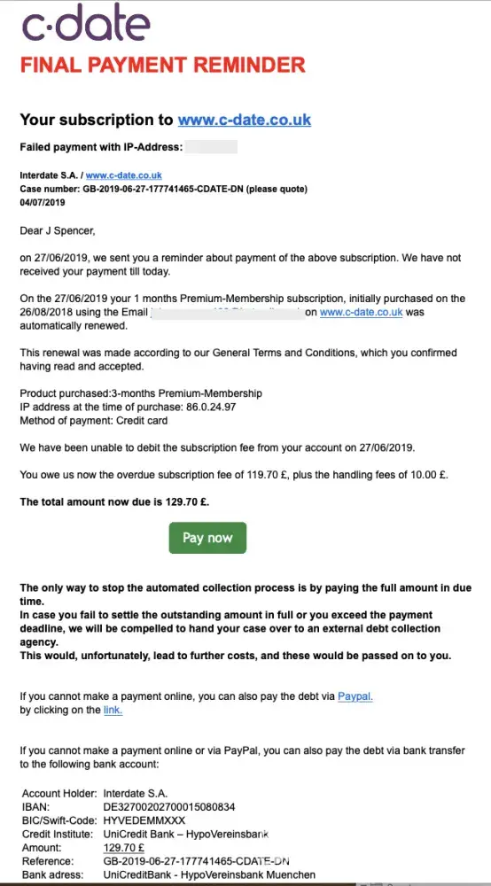 I have again been charged for another subscription and threatened with being reported to credit companies to have me listed as a bad payer. That I definitely am not hence do not appreciate being threatened with actions alike. I would have cancelled 5 years ago did C-Date alias Interdate SA provided an email to submit the likes to. I believe Interdate SA makes it almost impossible to cancel hence annual subs are becoming a passive income for them. I hereby submit my cancellation since I have paid the last amount owed today.