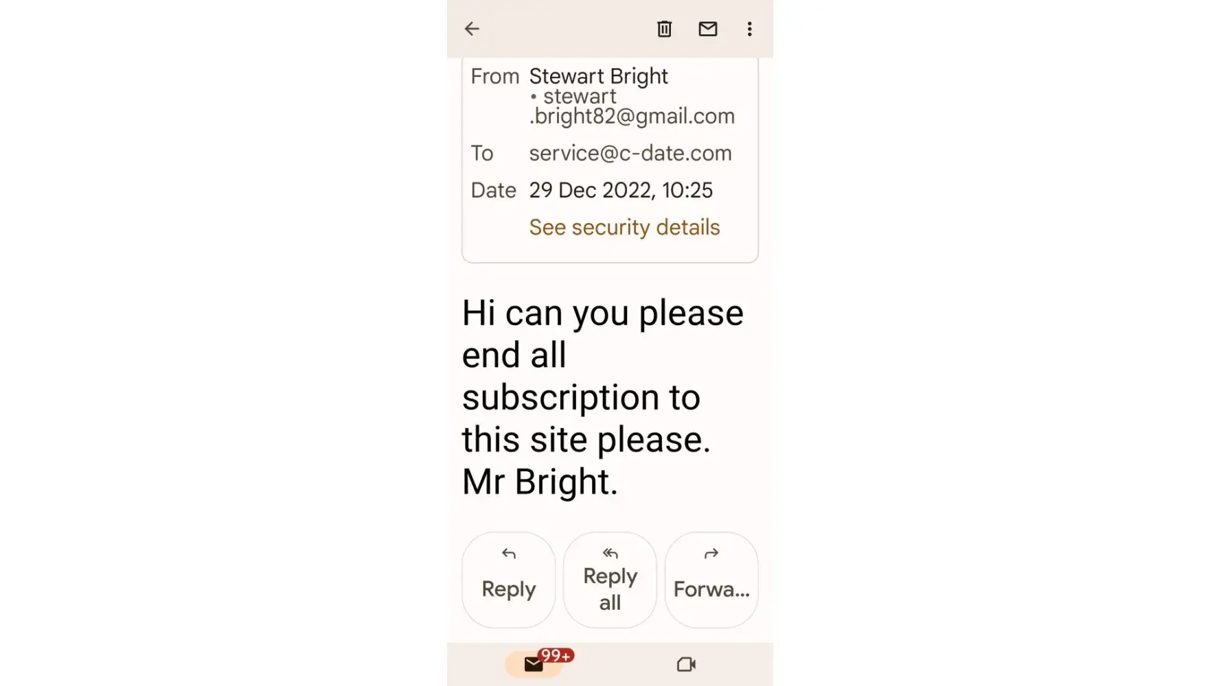 I tried cancelling the contract on line as advised by c-date but the wasn’t an option available. I then sent emails to [protected]@c-date.co.uk and [protected]@c-date.com with photos of hand written letters attached (as required by c-date) but both emails were not received. I have cancelled all PayPal payments but I am unable to confirm this with c-date.