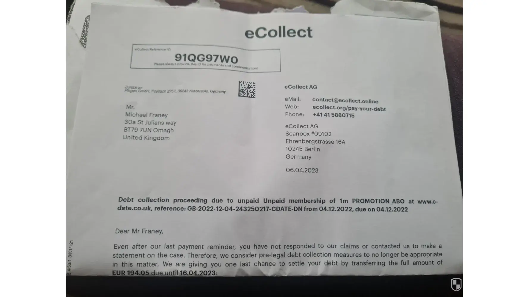 It has been more than 6 months and now I have received a letter from a debt collator company from Germany called eCollect stating I owe c.date £194.59.