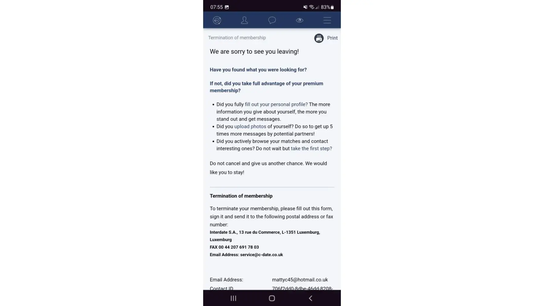 Desired outcome: C-date membership cancelled, account deleted and a refund