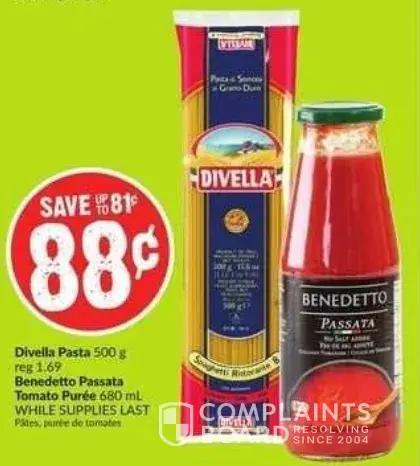 On the evening of Sat. Nov. 27/21, I was at the Burlington Upper Middle-Walkers Linen Freshco store and, among other things, purchased (or tried to purchase) 6 cases of "Benedetto Passata" which was on sale. At checkout, the cashier informed me that there was a limit of 2 cases, even though no such information existed on the price tag -- the only other information on the price tag, besides price, was "until supplies last". Furthermore, no such limit was specified on the Freshco flyer!