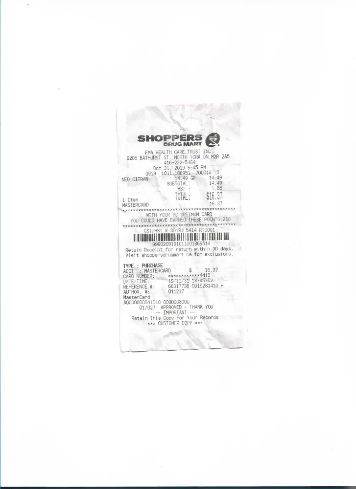I purchased "neocitran extra strength cold & sinus night apple cinnamon" from shoppers drug mart located at the above address and I paid 14.46+ 1.88 (hst)= $ 16.37