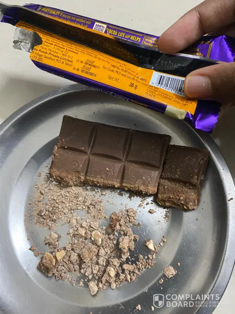 We found the chocolate broken in the form of powder in one side when opened the wrapper. Looks like some quality issue with the product.