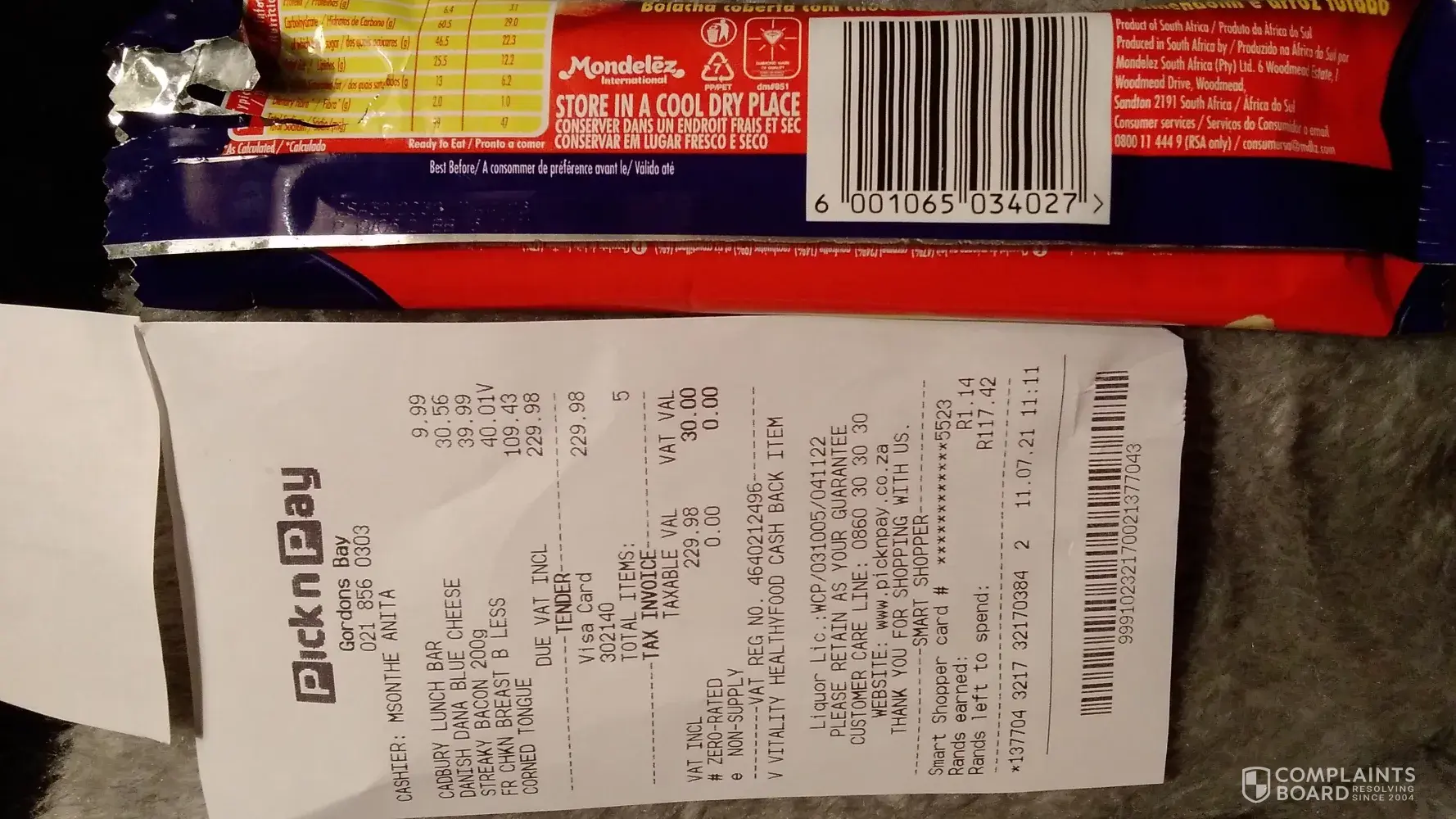 I bought a lunchbar as a once in a while treat for pensioners at Pick and Pay Gordonsbay today, and it was rock hard, very dissapointed and in pain, therefore this email.