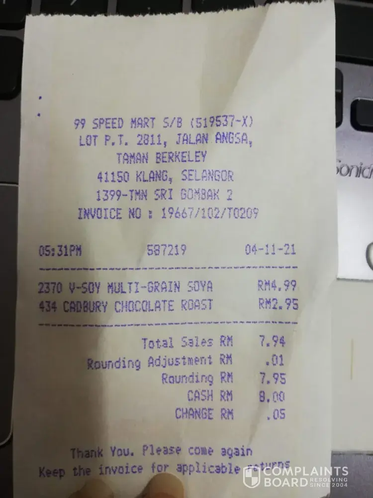 I bought a bar of chocolate CADBURY ALMOND CHOCOLATE BAR at 99 Speedmart near my house. After a few hours of reaching home, I decided to eat the chocolate, to my surprise when I opened the chocolate packet, there were tiny spots on the chocolate bar, and the texture of the chocolate was crumbled and there were also white spots on the rest of the chocolate bar.