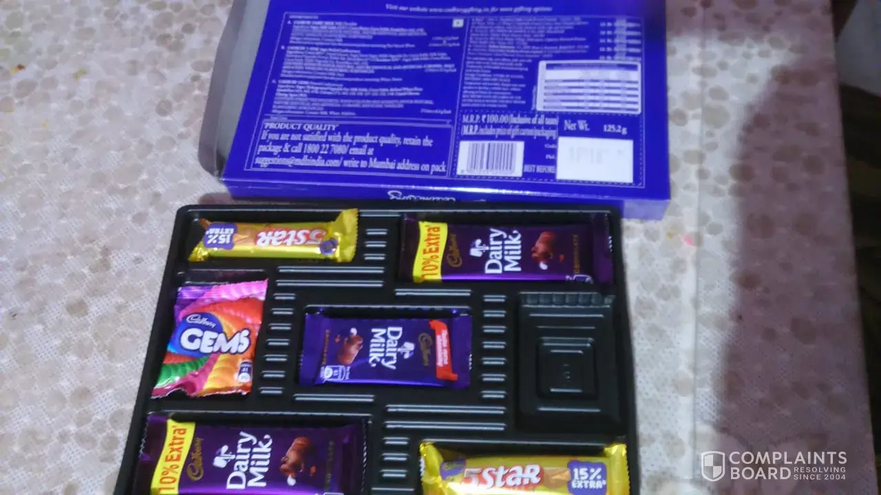 I would like to draw the attention of the authorities that I have been frauded from a most reputed company "Cadbury". As I bought a Cadbury celebration pack from a retailer in India and it was sealed pack when I bought. But after when I opened it came up that it contained 6 products of Cadbury's instead of 7. I did attached a photo so as to show it and I ain't of a person who blames anyone just for my perks. I just want them to look upon the products more precisely.
