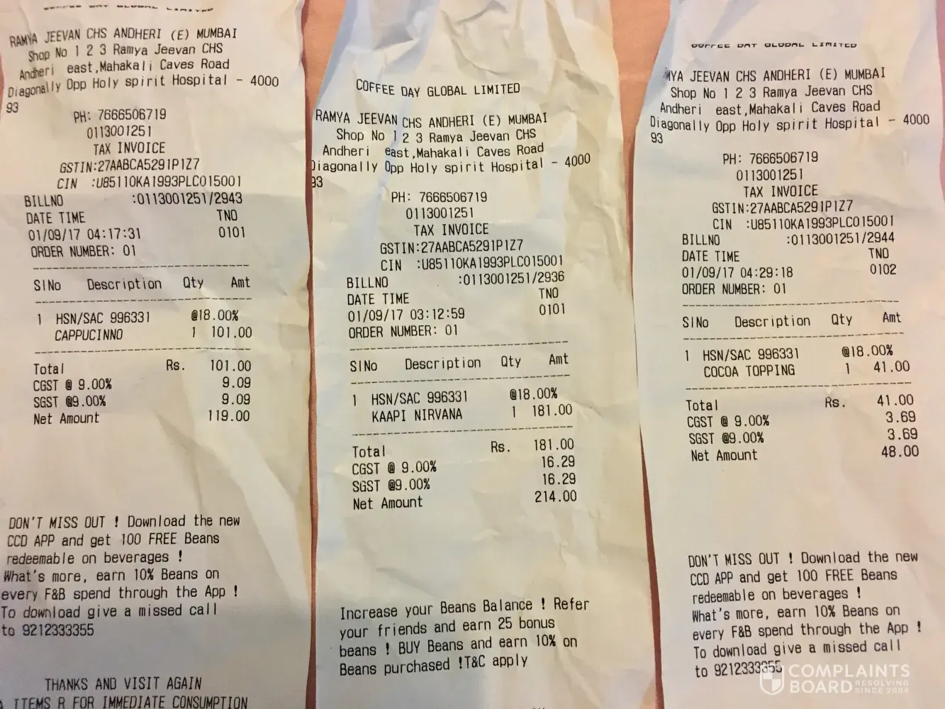 Your poor fixture and poor service. noone is there for me to give me any complaint number. because of a.s. m marriage and I got the number of mr gulshan written on the wall of the outlet. I really salute that guy. he is real gem for cafecoffeeday. because he know all the tacts to made a customer fool. because when I called him he just feel sorry and assure me that he will discuss this incident with high manegment and let me know the result.