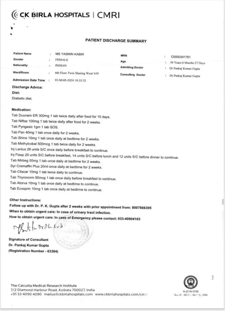 In my discharge summary they have not mentioned inj fiasp. Also they have mentioned Thyronorm 62.5mg in my discharge summary but in tpa discharge summary is mentioned as 50mg.
