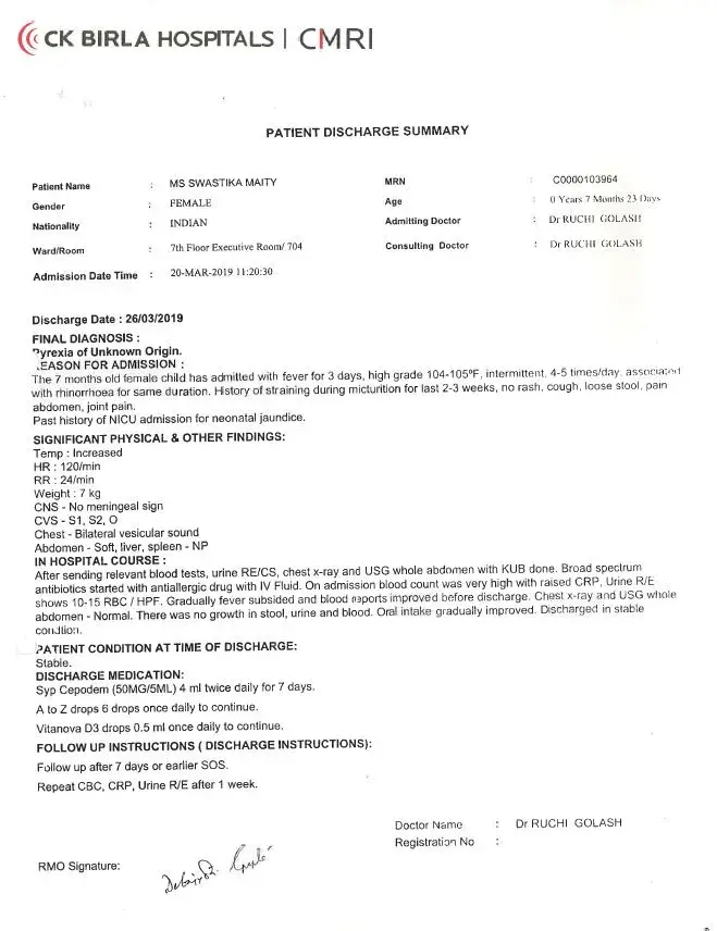 I also wanted to bring to your notice that after several follow with the doctor to understand the diagnose/root cause of why my daughter was getting high fever. But, since 23rd I was informed by the Dr. Ruchi Golash that she is unable to identify the root cause. The same version shared to me by the doctor Ruchi during the discharge. Please refer the attached discharged summary.
