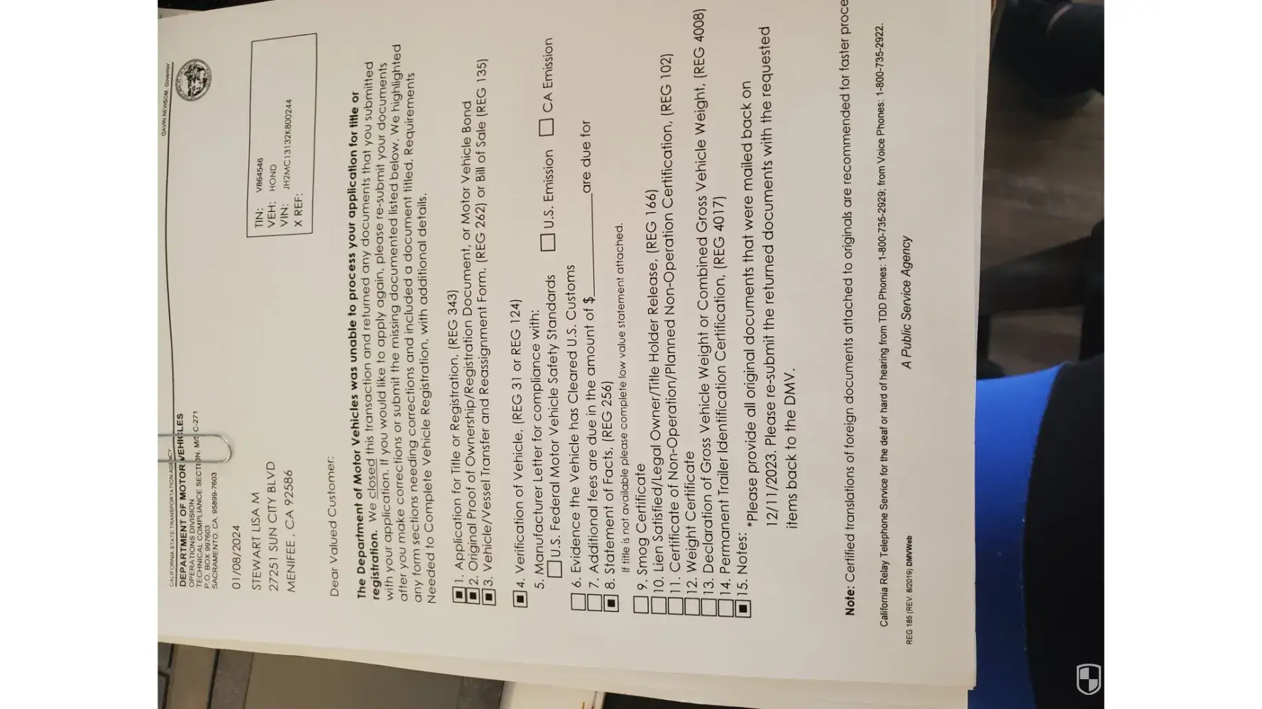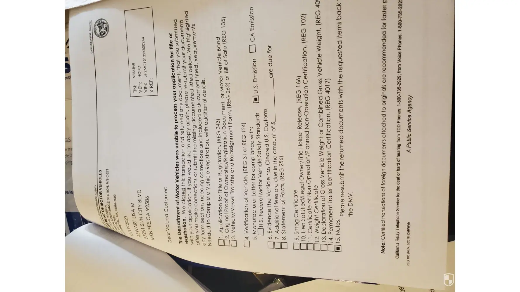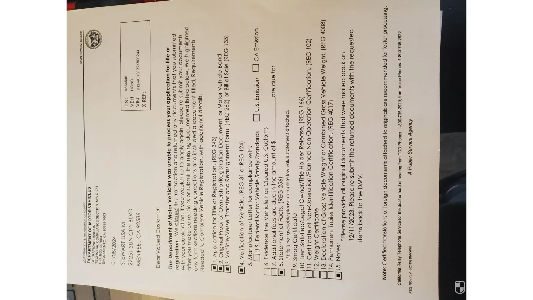 I have been to the Hemet DMV sending my records in trying to get my motorcycle registered, Since September 2023 this week will be my 9th time back and 5th time submitting new documentation long with copies of all of the previous documentation; yet my fees were paid the first time I entered the dmv. 197.00. Here Jan 2024 no plates or title but yet another form to complete. I have provided a REG 343, a REG262, a REG256, letter from manufacturer regarding the emissions label that is missing. Vehicle registration has been provided along with Vermont dmv statutes for Honda rebel 250 cc motorcycle does not have to have the title to register it since it is under 300 cc. Mind you this is a 2002 Honda Rebel 250 that sat in a garage in Vermont since 2002 it barley turn 6k miles when I drove it home with no plates because DMV gave me a red sticker in November2023. the sticker was not engraved I was instructed to get a label from the manufacturer; they sent a letter and stated we get these quite a bit and a letter should suffice. Now California dmv wants a statement a statement of what. state it came from Vermont , You have that information and the plates What efforts have been made to get the title the person who sold it to me? The owner completed and gave me a statement REG262 with the exact same questions for me to answer on this new REG256 form. I just want to get the plates that I paid for. I bought a bike tried to register it California is refusing, to register. This literally is weaponized bureaucracy and biased at its best and I work for the state of California. No wonder so many of us native California's just want out and away from this state. Please help me understand this madness.