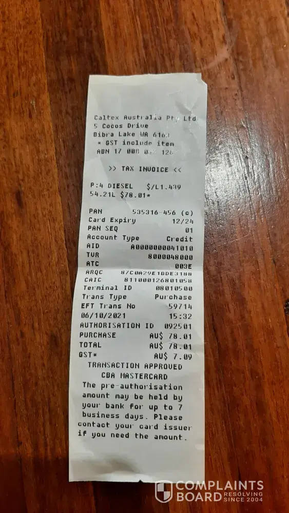 Yestrrday I put $78.01 diesel fuel at an unmanned sites and got a receipt from the machine. Why was I charged $100 from my mastercard and why is this so called 'normal practice' then sorted 7-9 business days later when I should be charged just the amount receipted. Surely this is very poor practice that I then have to check later with my bank that it has been recredited. There was no obvious alert to this pathetic system at the bowser. Surely you could just charge the amount purchased.