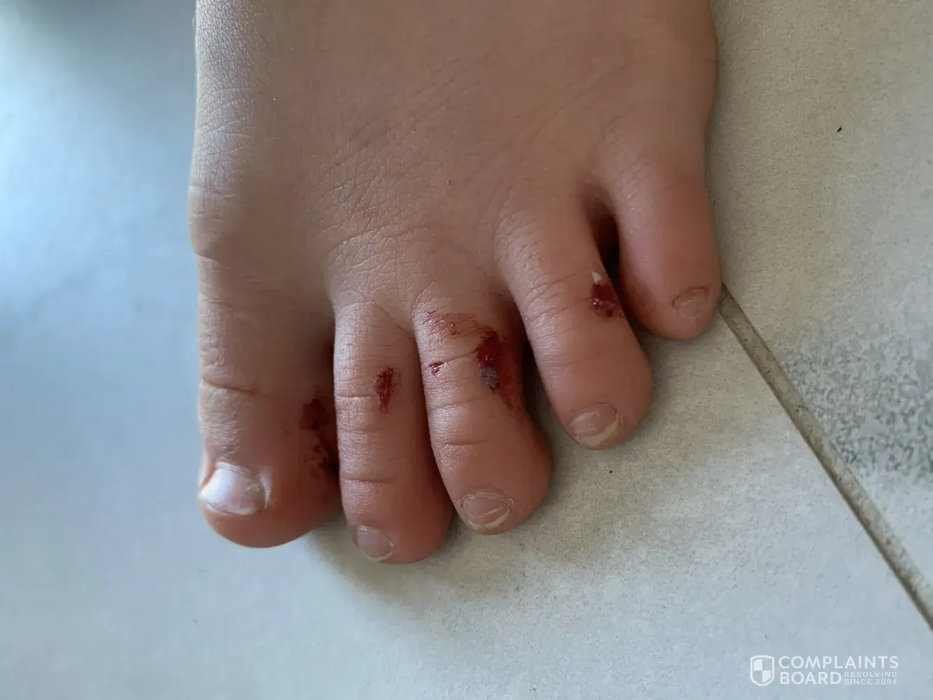 Assistance was offered by the attendant at the petrol station, he didn't even ask if she was ok when she was visibly inconsolable and in a lot of pain. These doors need to be seen to, maybe rubber on the bottom so this doesn't happen again. I am keeping an eye on her toes in case there is any more damage than just superficial.