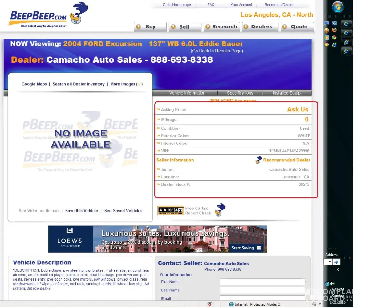I purchased a 2005 chevy truck from ed camacho a few months ago. The price seemed fair and ed sold me an extended warranty (he insisted that I should buy it). Well, i've had a transmission mount break off since then and when I called the warranty company, they told me the warranty never existed and they never heard of ed camacho or camacho auto sales. This crook charged me $500 for a warranty that is worthless!