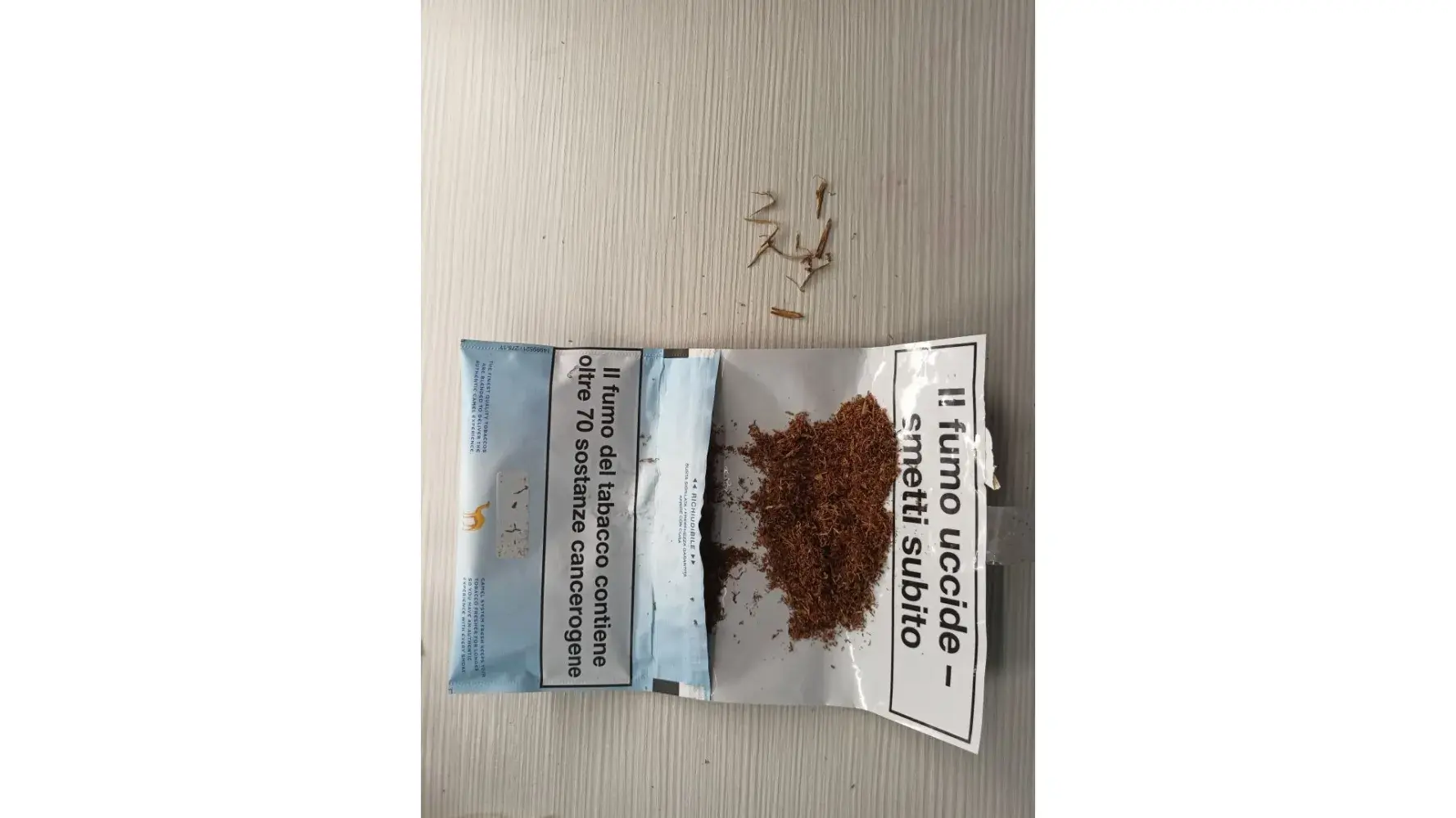 As you can see in the photo I found al of that in just that much tobacco that's left in the packet. I just have to throw it away. Everytime I open a new pack I just have to pick every piece out. This thing is becoming a regular thing with every packet.