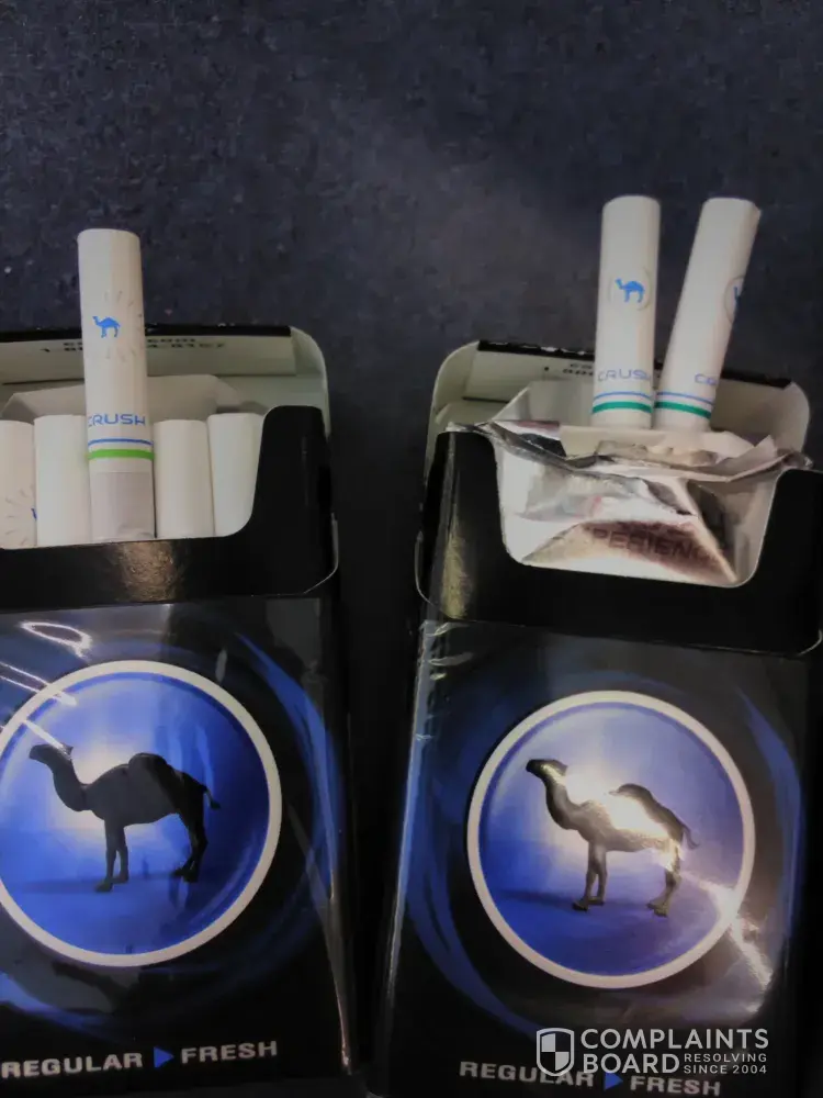 I am very disappointed that I have to write a complaint to you guys. I have only bought camel products for the past 4 years, this is the first time I've been extremely let down by the product. I bought a pack of camel crush menthol silver today, on 5/27. I have now smoked 4 cigarettes out of this pack, when I went to crush them the ball was already crushed, and they do not taste as menthol as normal. I am not sure if this is something that happens but I have never experienced this, and I buy 2 packs everyday. I am very upset as I do not have money to go and get a new pack to replace these right now, and I feel as if I wasted my money. Is there anything that can be done?