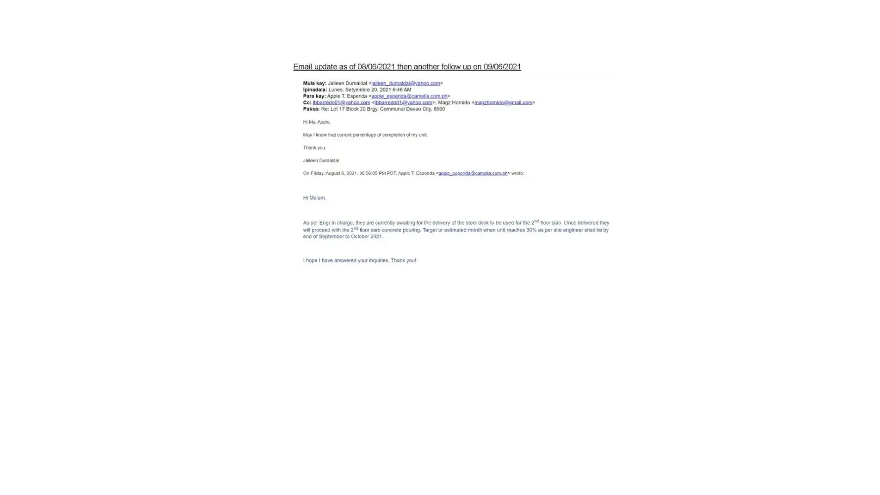 I purchased my unit on May 06, 2019 and paid P40,000 reservation fee and fully paid the required down payment by May 30, 2020 (within a year) amounting to P769,284. After that I am paying in house until 30% completion is reach as per the requirement of the bank for 1 year and 4 months. Total payments made is already P1,576,998.73. As per contract, 5 months from the start of paying the down payment construction will begin and within 18 months it should be 100% complete and with a year there will be a turnover. I am very diligent in making follow up since I am overseas (in U.S. ). In June 2021, after 2 years and one month construction is still at 15%. I am asking them to have a commitment for the 30% completion since I am also working on securing the bank loan and processing the required documents but there's no any good feedback from the "Engr Apple". They just keep on "acknowledging receipt of my email". I am losing HOPE and its giving me so much inconvenience (financially and mentally). I’ve been very understanding and patient about the COVID-19 Pandemic situation as your reason for construction delays. But I needed a commitment of 30 % project completion as required by the bank for my loan. On August 6, 2021, Ms. Apple emailed me and told that by September or October 2021 30% completion of the construction will be done. However, the promised work was not delivered. This makes me feel that your company are not taking your client seriously and will not like to pursue contract to company with such values. I am losing hope. I wanted to pull out my funds, I already sent a formal letter to terminate the agreement but I received no feedback just "acknowledgement of your email".