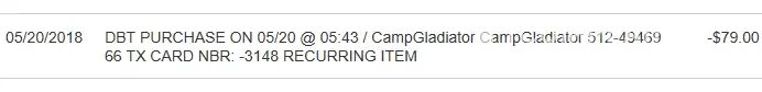 Camp gladiator is a shady, fraudulent business! I joined cg in the spring of 2017. I signed up for a 6 month membership at $79 per month. More than 6 months passed, and while I used my membership and enjoyed it, it was time to cancel it. It is becoming clear that there is no way to do this. I called twice, and had to leave messages. I never got a return call. There is no instructions on the cg website for cancelling. After paying for another month that I did not plan to use, I went to my bank and paid for a stop payment on the automatic draft cg was taking out every month. For two months, this worked. This month, I had yet another $79 charge, but instead of the charge being from "cgnation" as it has been for the past year, it was labelled "campgladiator" on my bank statement. (pictures below) I called my bank and they agree this is fraud. A call was placed to visa by my bank, and I was able to get my money back. My account number has been changed, and i've been assured that my account will be watched closely. I'm glad I have a bank that is willing to fight for me.