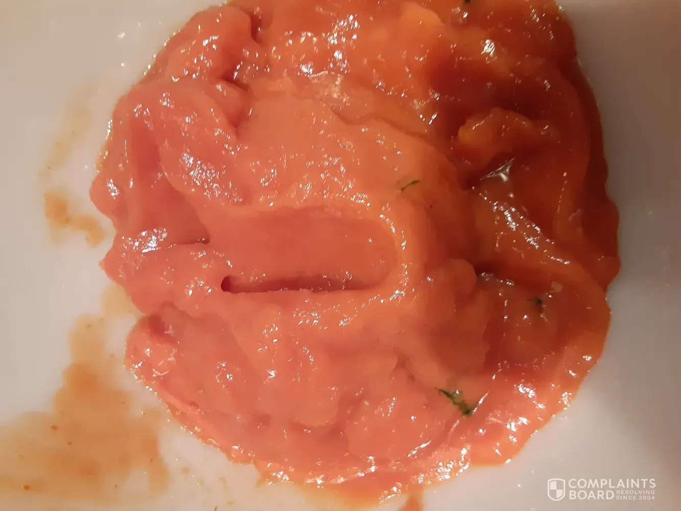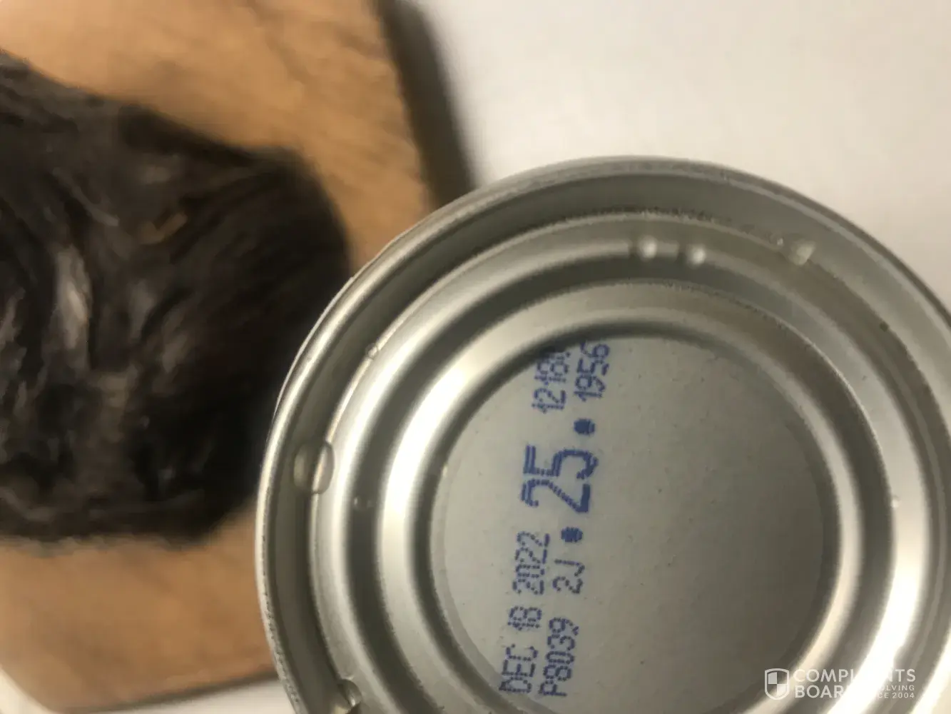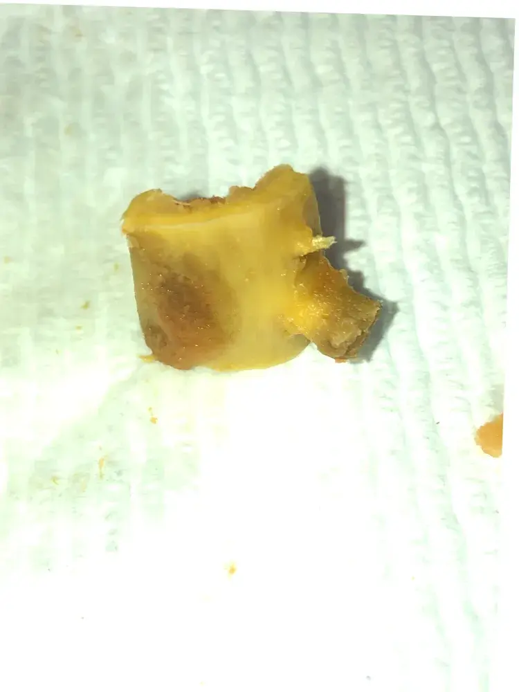 This is what I found as I dipped my spoon on to the can because I'm to inpatient to heat it up, almost broke a tooth on this large chunk of bone ! And even to make matters worse it is like discolored it looks like the meat on it is raw and the bone marrow is still there.