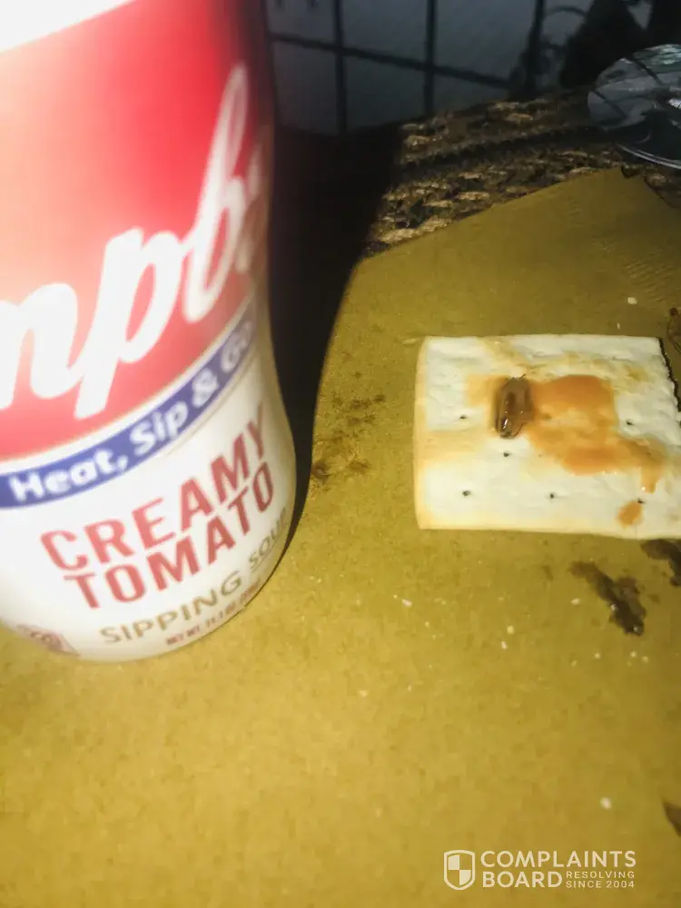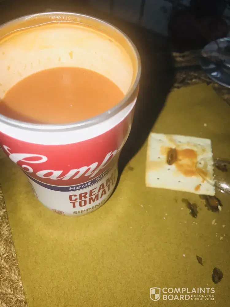 Cockroach was in Tomato soup, cockroach was full bodied. Please do not ever ever sip this soup from the can. I heated in microwave in can then didn't put lid back on, Thank God. I didn't sip it but spooned it. There was a full bodied cockroach in the tomato soup. Seen it after I ate about 2 inches Of soup and stirred it... Was sick to my stomach. Threw up...