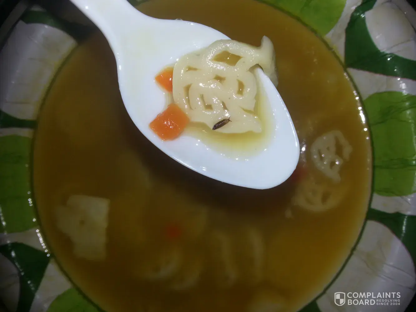 My 8 year old daughter was eating Campbell's Scooby Doo Chicken and noodle soup, when she got a strange look on her face then started gagging. I asked her what was wrong when she handed me her spoon and there was a dark brown maggot looking bug on her spoon! This is absolutely unacceptable! We all lost or appetite and my daughter vomited several times because she actually ate several bites of soup before she noticed it! We will not be eating anything out of cans anymore, especially ANYTHING FROM CAMPBELL'S! So much for soup and sandwiches for dinner. Non of us really have an appetite now anyway! See photos below!