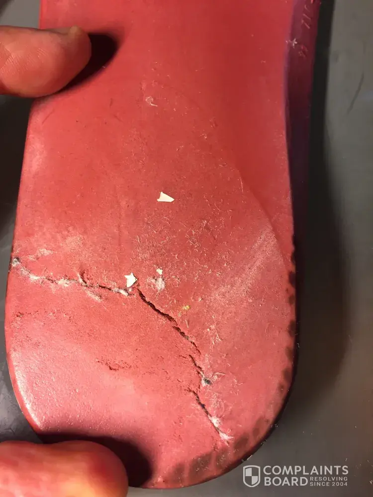 It looks to me as if ALL these newer red rubber insoles are inferior. The rubber is split underneath and where my hells strikes the insole it is starting to fragment and pull away. I have a blister forming on my heel where this hole is appearing.