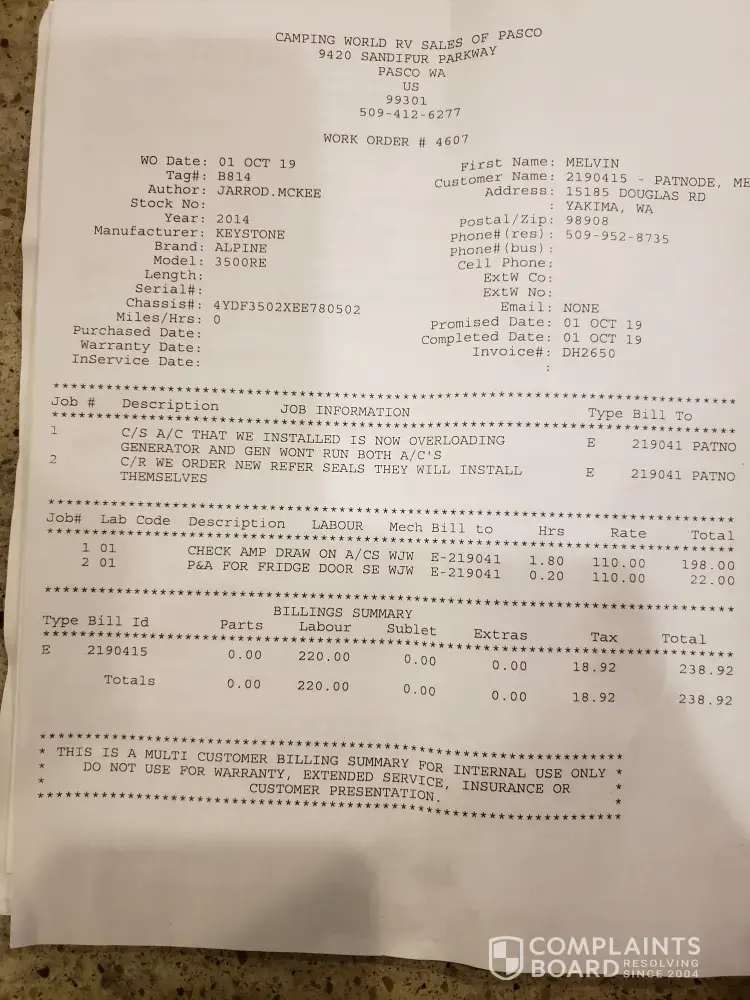 In order to resolve my complaint, I would like Camping Work reimburse me for my labor cost paid to Camping World and parts. Request Camping World reimburse me $1, 227.98
