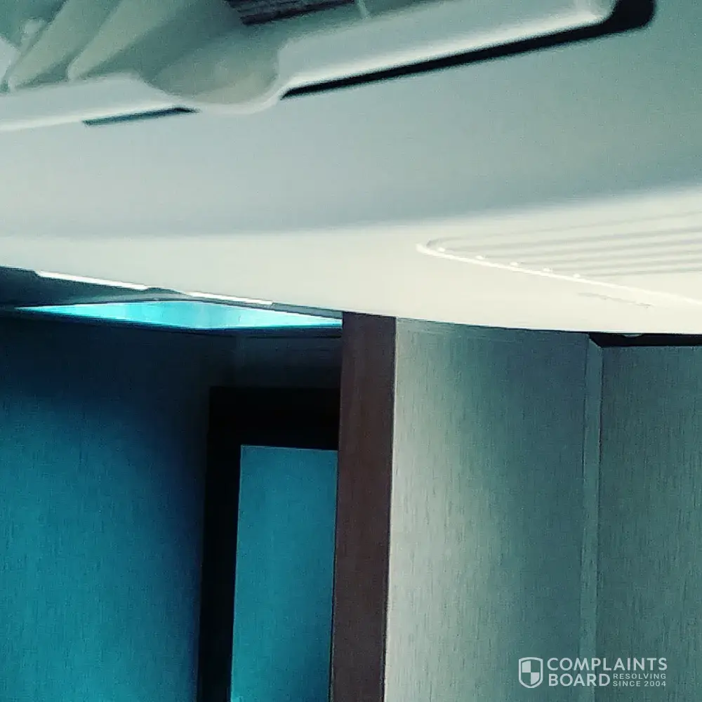 There is an issue with the air conditioning you installed in the 5th wheel. You installed the a/c in the bedroom and the bathroom door hits the air conditioning unit so that the bathroom door does not open. It opens slightly. A person cannot fit in through the door. Didn't your person installing the a/c examinge the unit after installing?