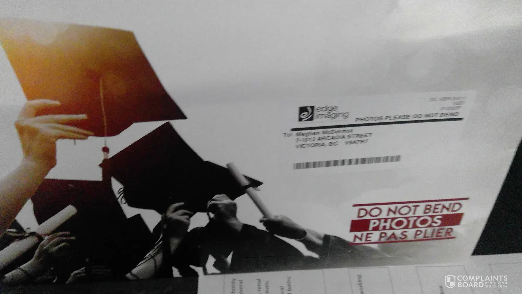 On June 30th, 2021, a package was delivered to my house. The package indicated that it was photos and do not bend the package, well the package was bent. The photo has a crease going down the right hand side of the photo. The photos are my daughter's graduating pictures. Fortunately, only 1 picture was bent, but it was the 8x10 photo. I would like to have Canada Post pay for another 8x10 photo