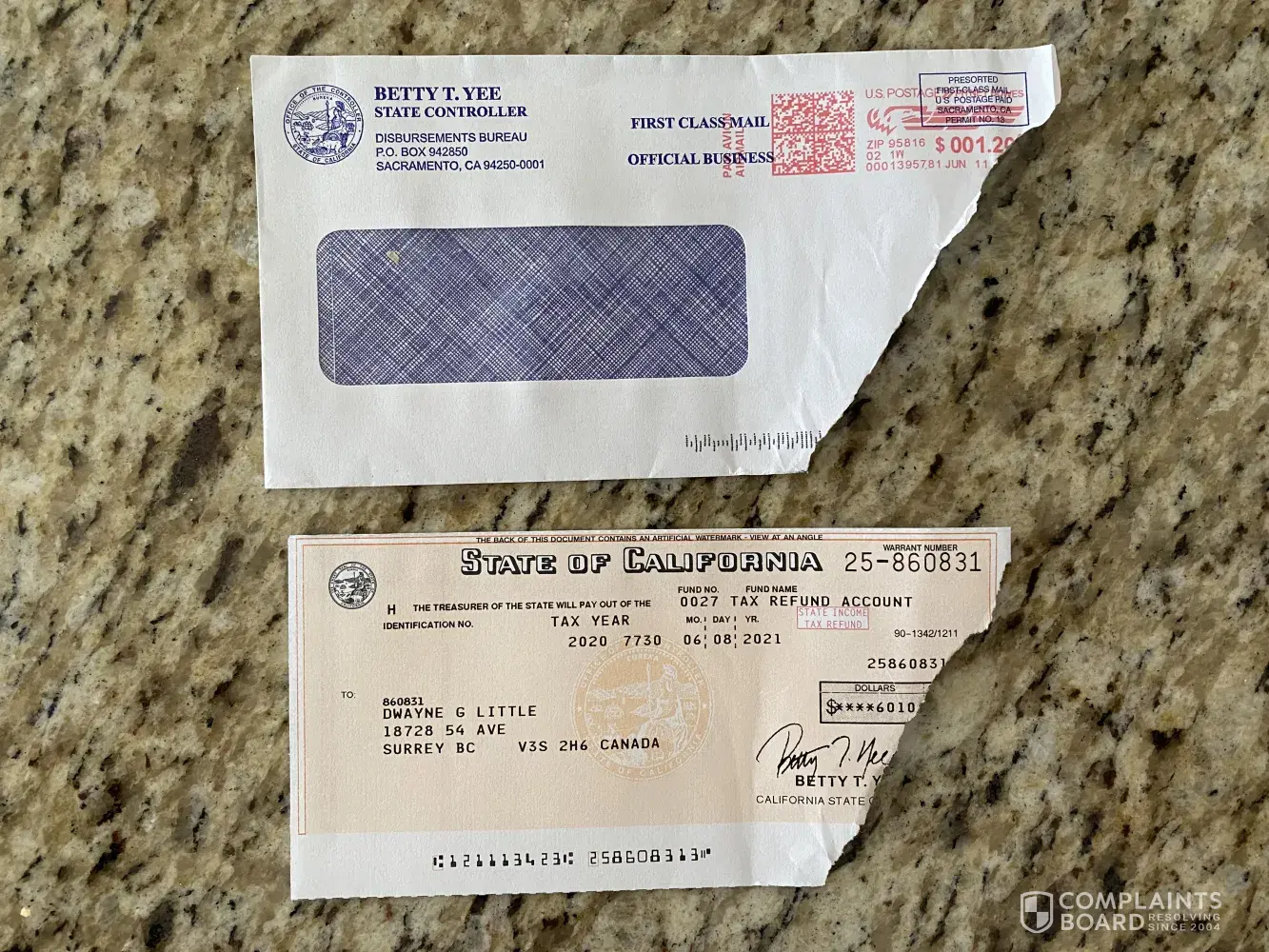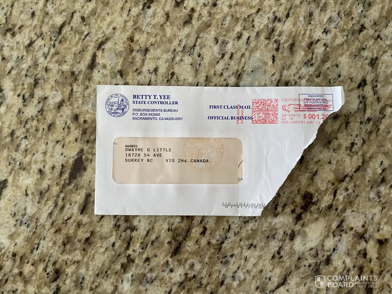 I received a cheque on June 23, 2021, which the envelope which contained a cheque from Betty Yee State Controller, California was ripped in 1/2. I made a complaint - I received a call back from Tina in Cloverdale at [protected] ext. 2004. I had missed her call, but did call back in 3 hours and left a message, I did not hear anything back.