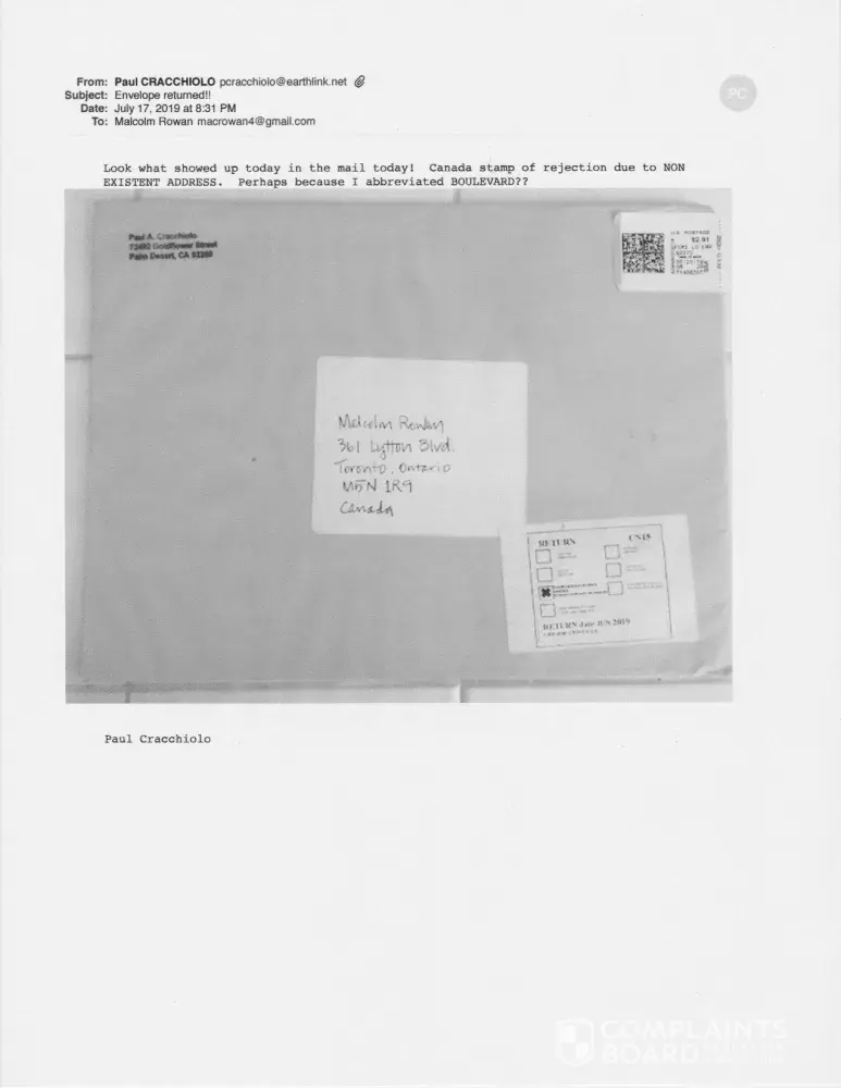 Read full complaintletters having correct typed mailing address being sent back to sender
