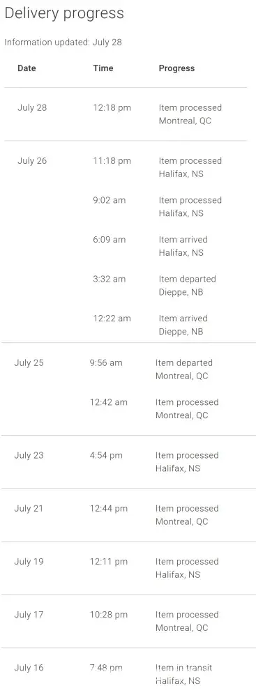 The attached photo is pretty self-explanatory, I mailed out a parcel to Calgary, Ab from Halifax, NS on July 16th. I purchased the Canada Post flat rate box and had it packed, sealed & addressed at the Scotia Square PO. Ever since it has been in a perpetual loop between Montreal & Halifax. I have contacted their customer service line 2 times and have asked for someone to call me back but have heard nothing. I also stopped in the Scotia Square PO and showed them what was happening, he phoned the depo and told me they would call me back shortly. Crickets.