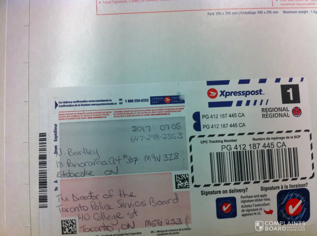 I was told mail was sent to me at two different address I sent documents by Canada post and paid for a signature and parcel went missing to peel police board [protected], [protected], [protected] recently I had to ask my phone company to resend my bill as I have not Recive the last two and no explanation of why a 911 call on April 11, 2016 was not on my bill now I send the last packets sent by Canada post paid for signature on five packets two of the packets was not signed for .