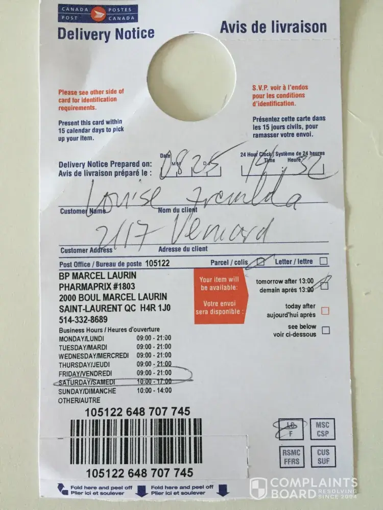 Was not at home to sign for my package on Friday, August 25th 2017. The delivery notice card circled the business hours on Saturday as being from 10:00 to 17:00 and the box was checked that I could pick up my package after 13:00 at Pharmaprix post office # 105122.