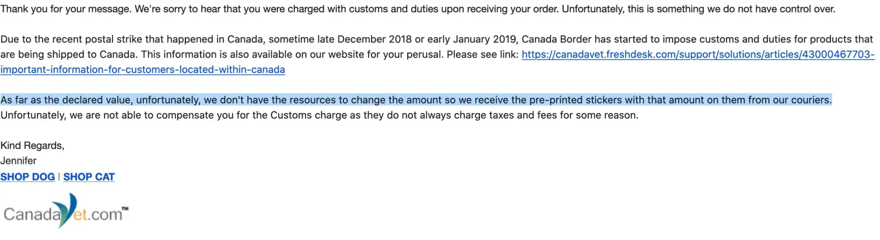 Contacted the customer service, they blamed postal strikes and said "As far as the declared value, unfortunately, we don't have the resources to change the amount so we receive the pre-printed stickers with that amount on them from our couriers." PRE-PRINTED STICKERS THAT THEY CAN'T CHANGE... such nonesense. I have photos of my receipts, the packaging and the customs form + the email, if anyone needs proof.