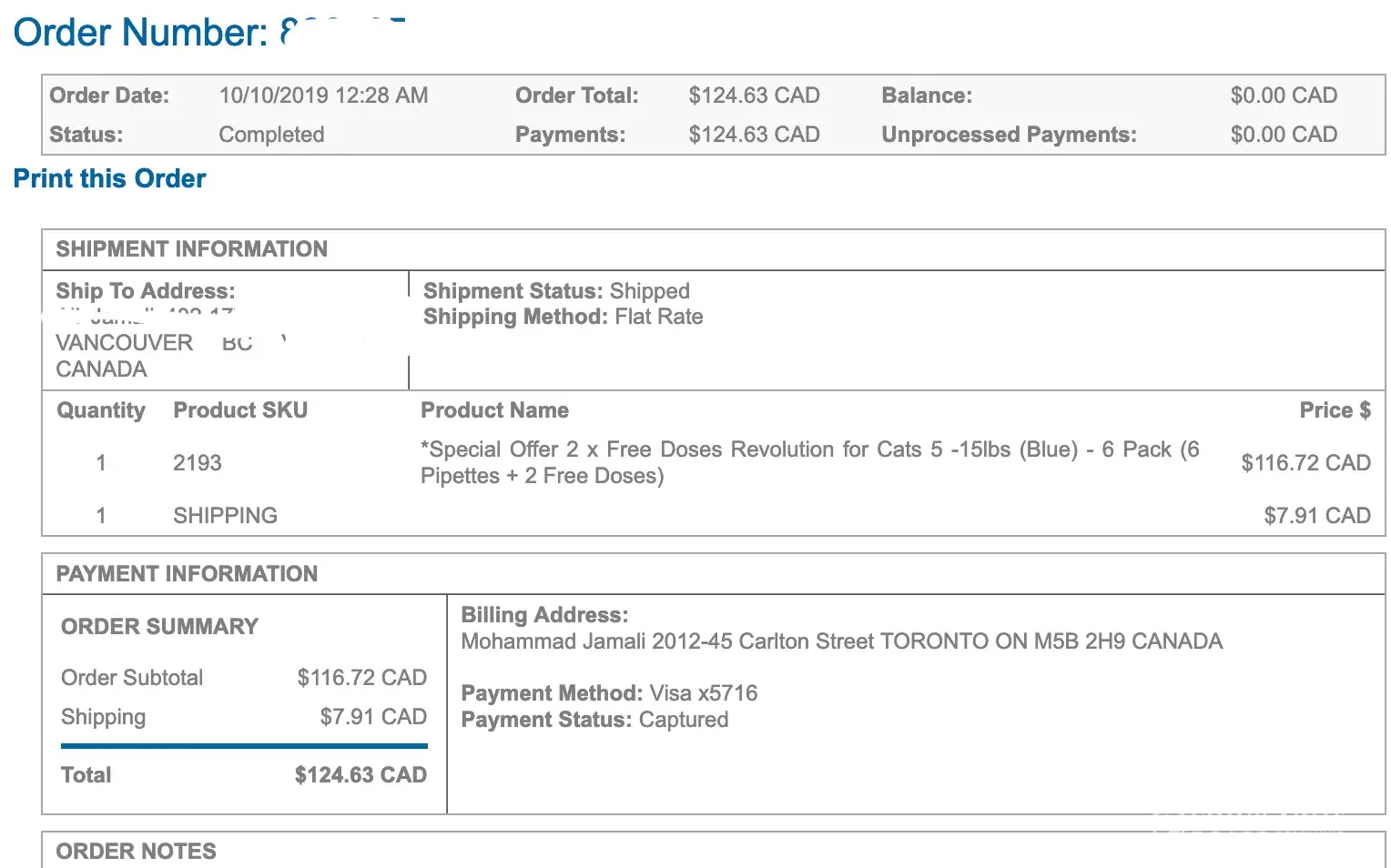 All they said was that it was shipped via Canadian and US postal service and that they will not give me a tracking number. I want my money back. How can a company ship something and keep not records of it to track where it is or where it went? I want my money back so I can get flea and tick meds for my pets.